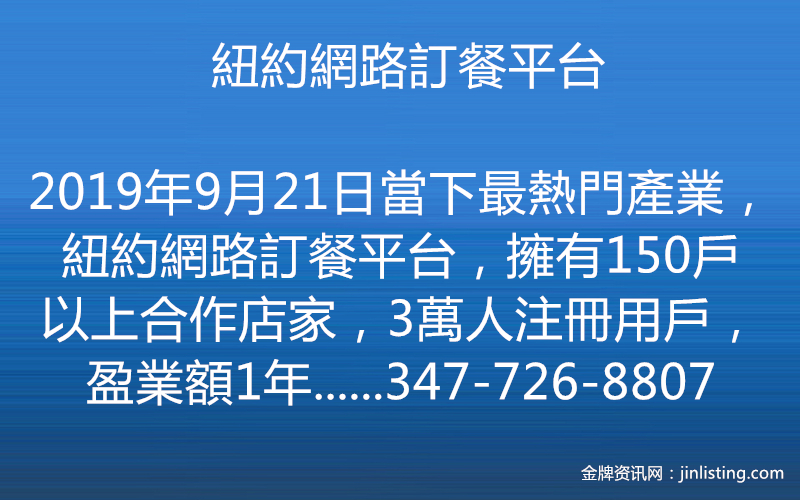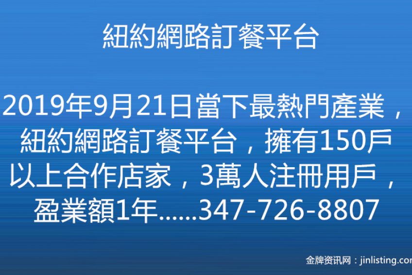 當下最熱門產業,紐約網路訂餐平台,擁有150戶以上合作店家,3萬人注冊用戶,盈業額1年250萬,有意出售 Cel:347-726-8807