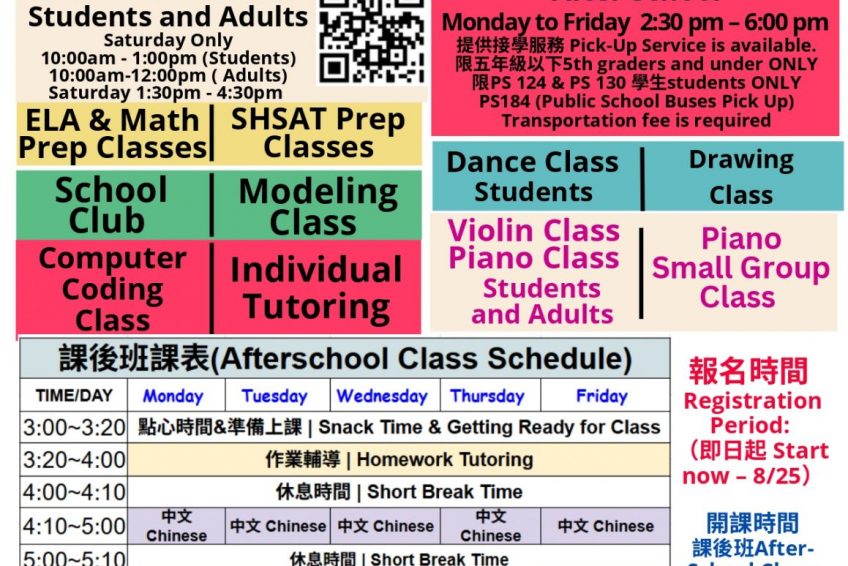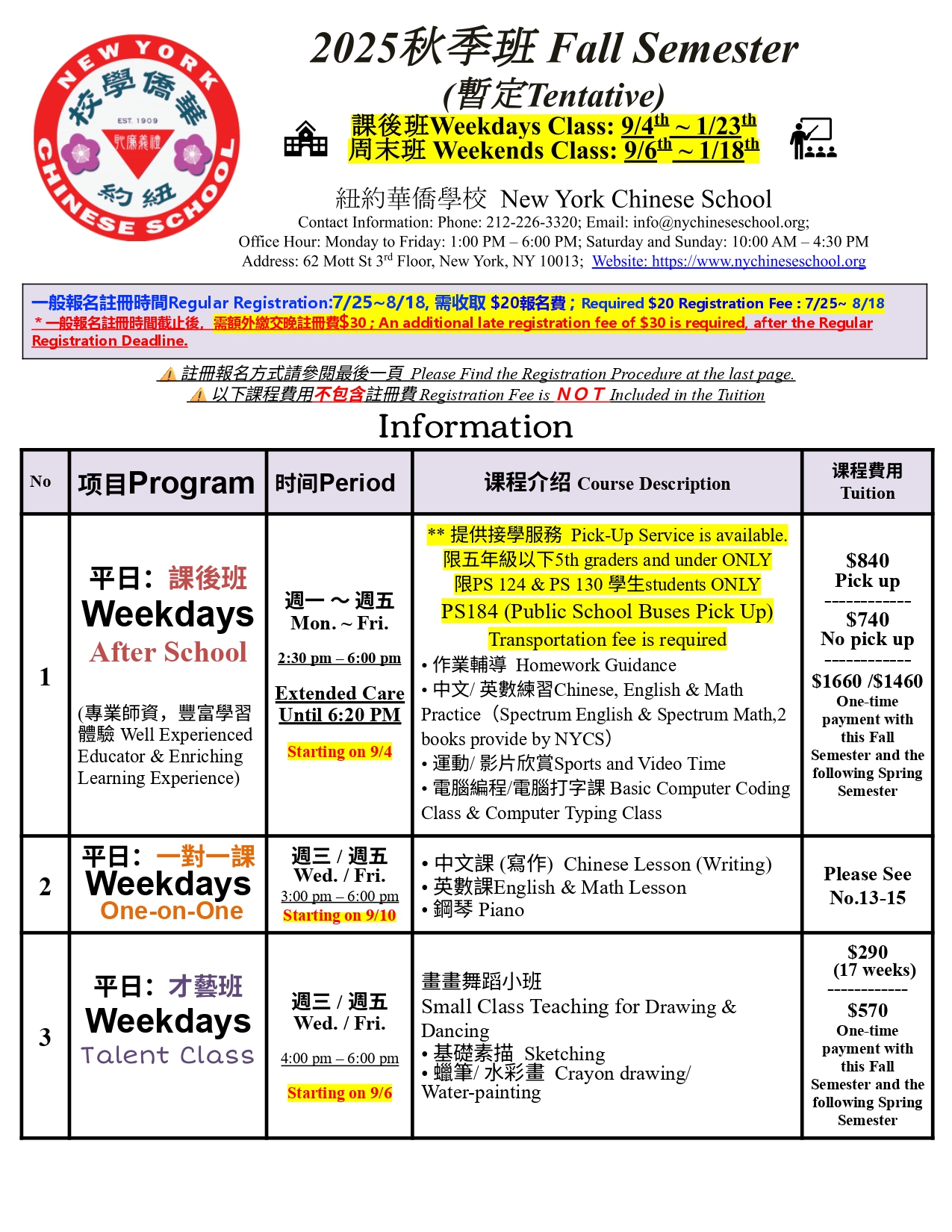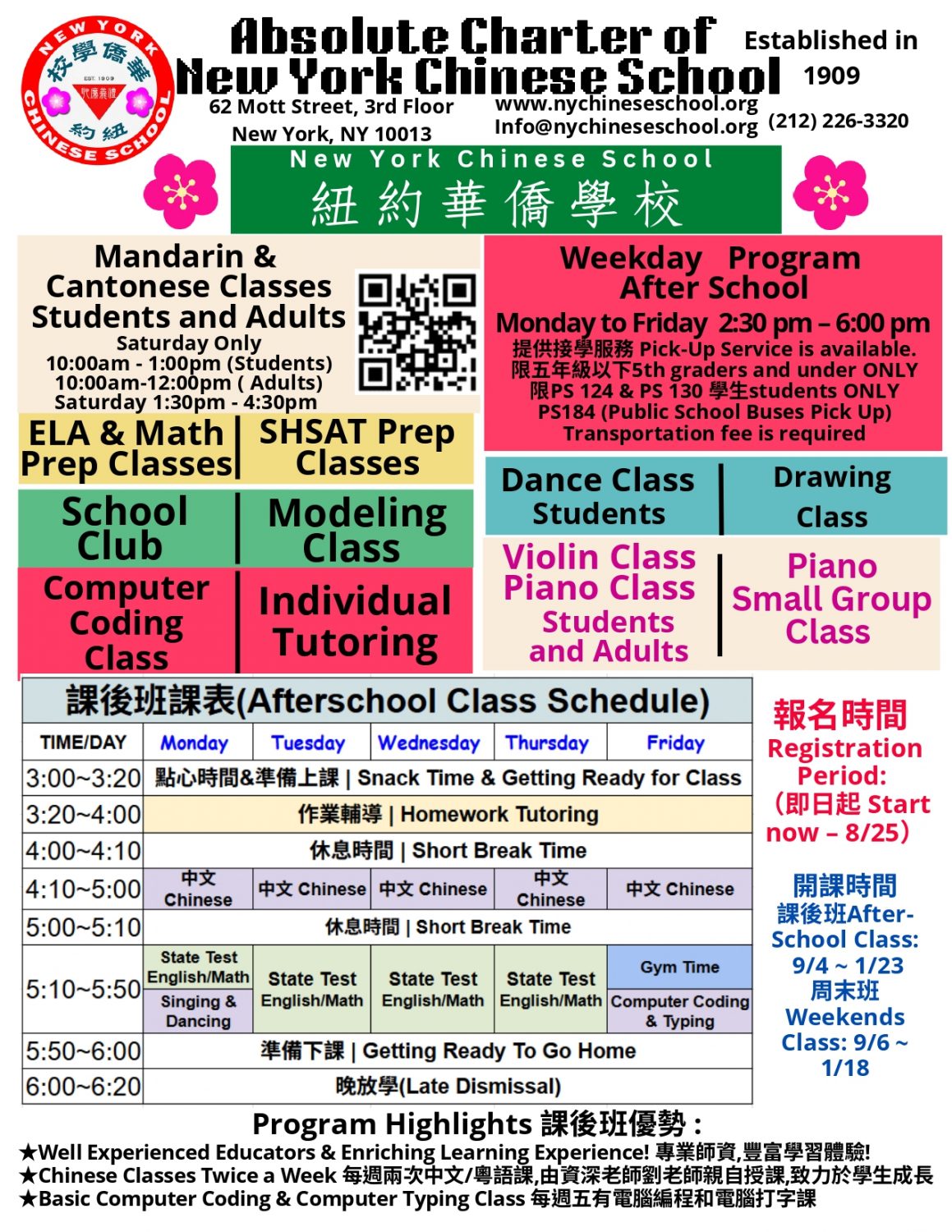 As the largest and oldest Chinese school campus in North America, we provide a safe, clean, and welcoming environment where children can focus on learning and personal growth. We warmly invite your child to join our 2025 Fall programs. Attached are flyers for our Afterschool Program, Weekend Programs, Piano Course, and more. More details can be found on our website: www.nychineseschool.org.