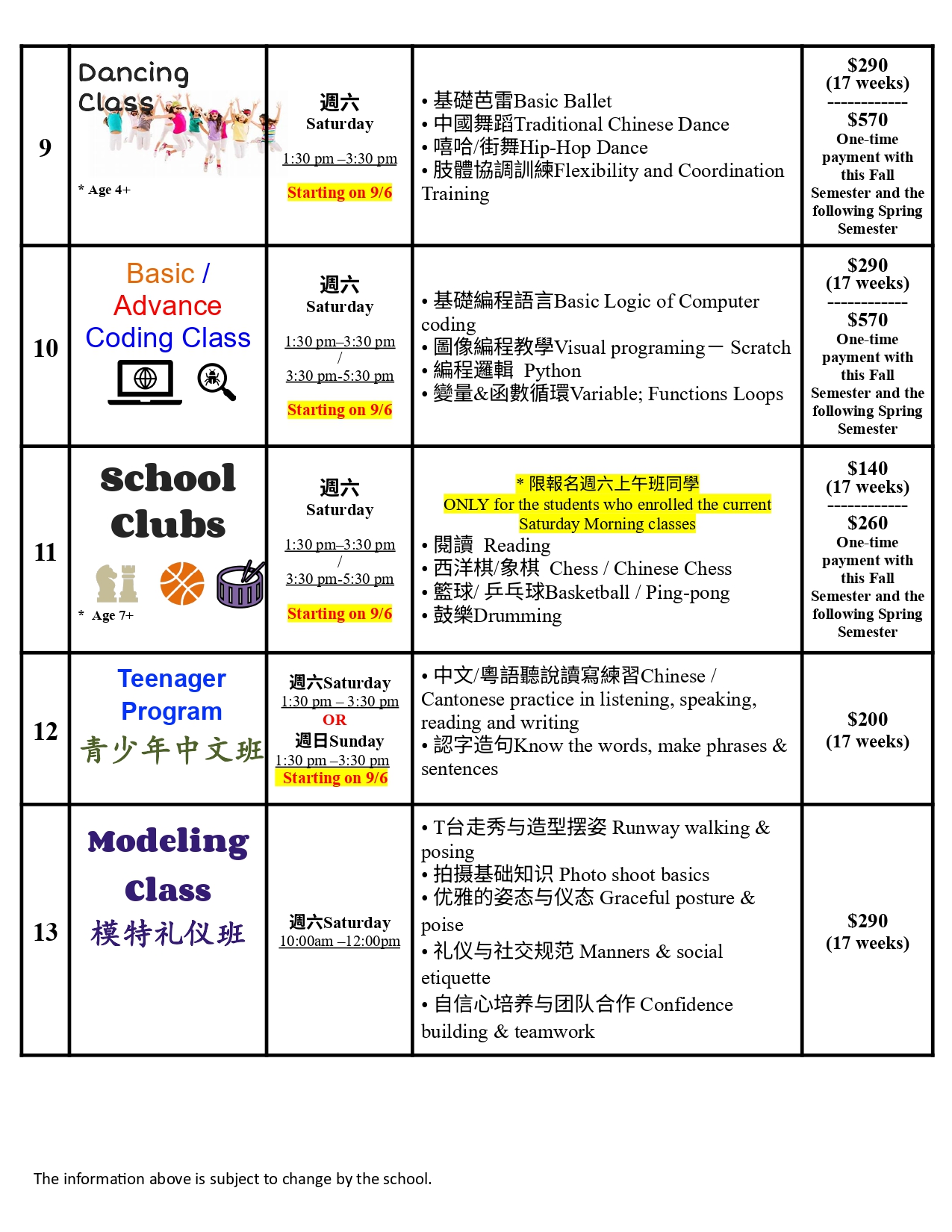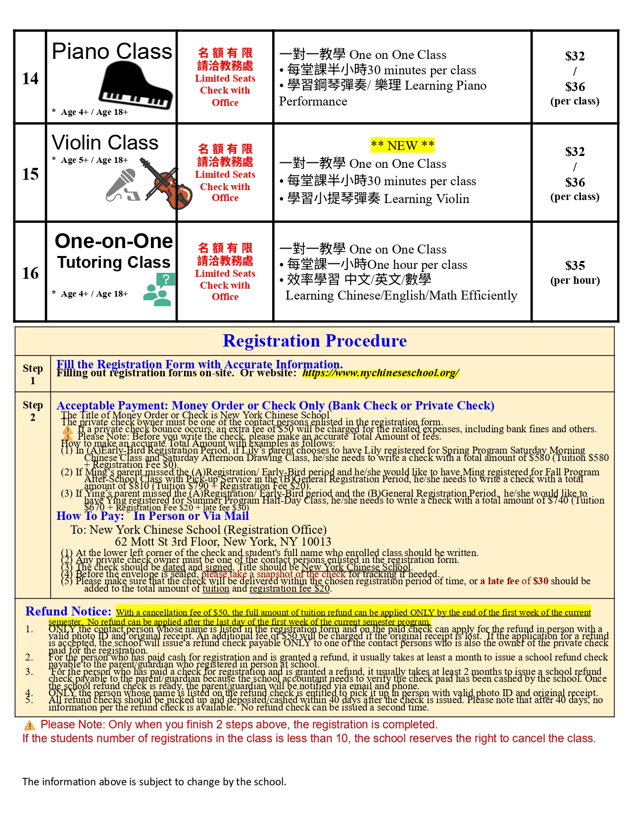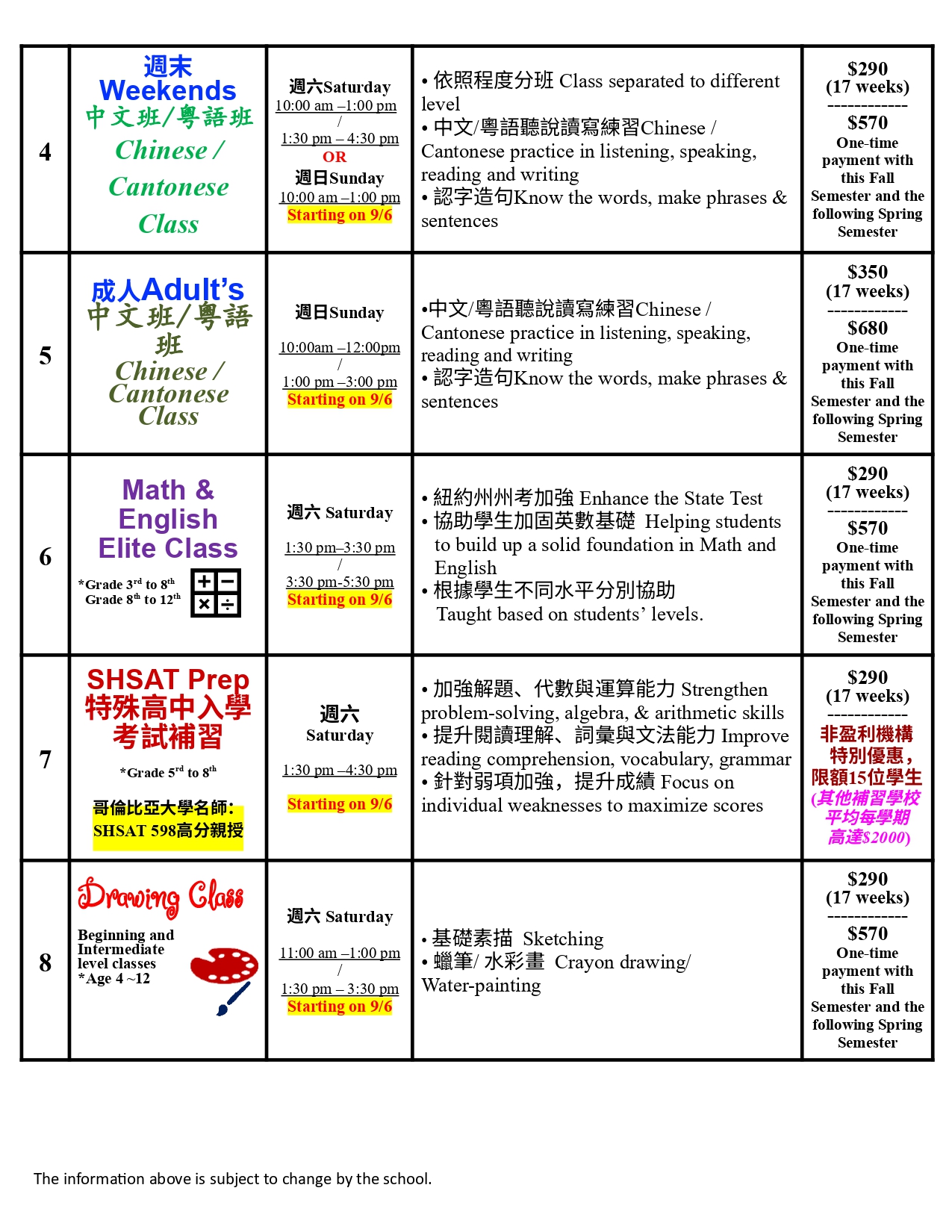 As the largest and oldest Chinese school campus in North America, we provide a safe, clean, and welcoming environment where children can focus on learning and personal growth. We warmly invite your child to join our 2025 Fall programs. Attached are flyers for our Afterschool Program, Weekend Programs, Piano Course, and more. More details can be found on our website: www.nychineseschool.org.