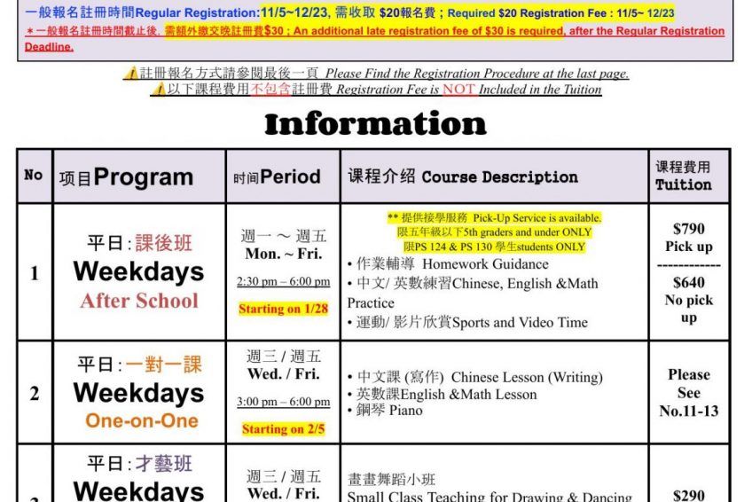 1. With the shortage of human resources as a non-profit organization, it is highly preferable to contact us via email if you have any questions. We will return to you ASAP and please do not hesitate to reach out if there are any concerns. Email: info@nychineseschool.org (Note: Assistant Jiaxin)