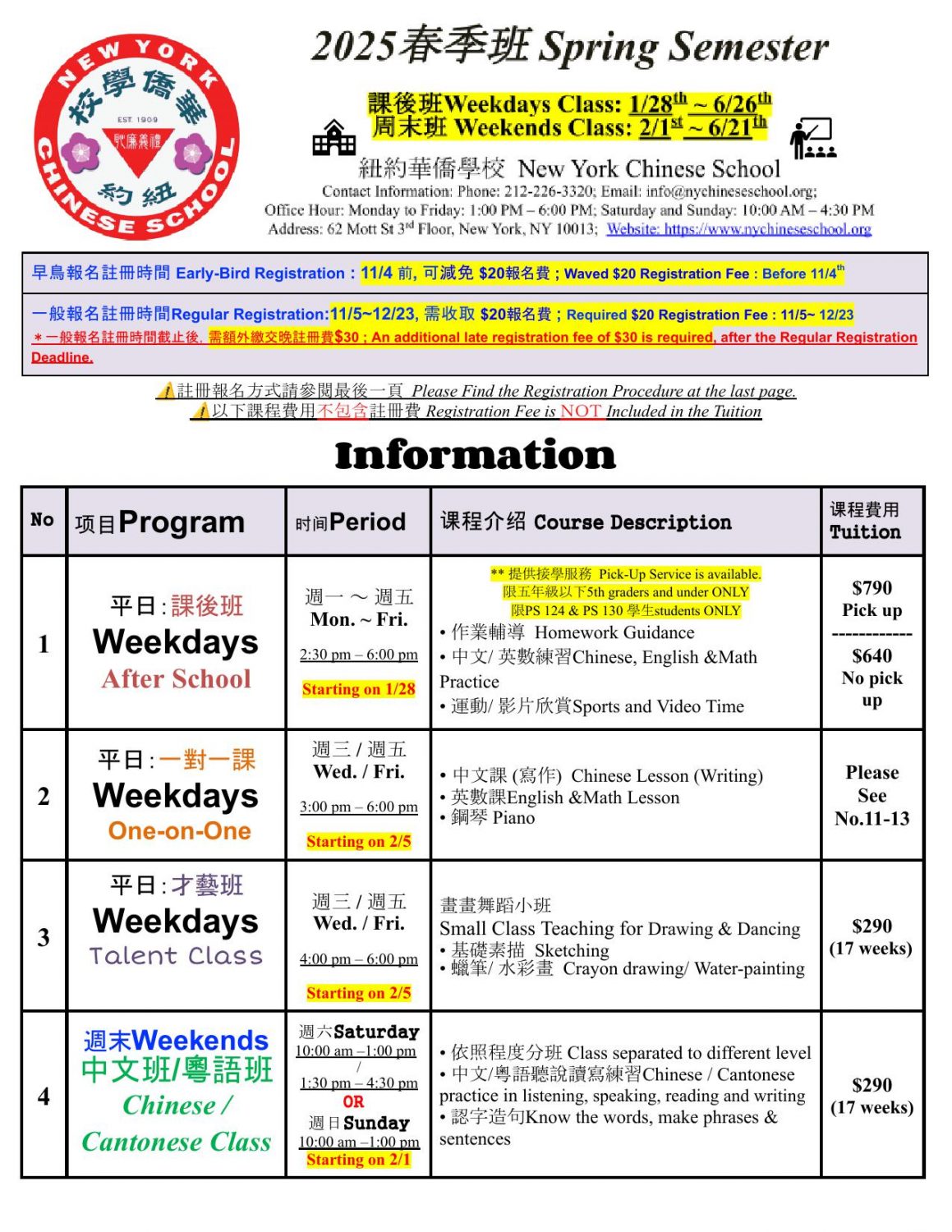 Thank you for your continuous support of New York Chinese School. We sincerely welcome your child to attend our Spring programs. The programs are conducted online and in-person. Enclosed you will find the flyers for 2025 Afterschool , 2025 Spring Semester Weekend Programs, and Piano Course. (https://www.nychineseschool.org/)