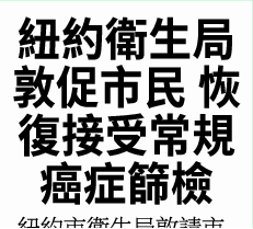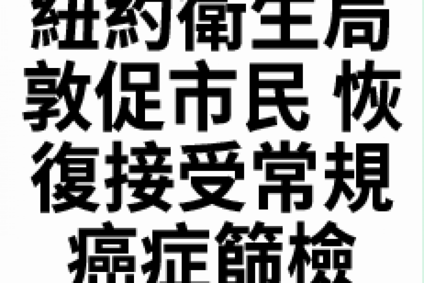 紐約市衛生局敦請市民、尤其是高風險人員,儘快恢復定期接受包括肺癌、結腸癌、乳腺癌和宮頸癌在內的各類癌症的常規篩檢。
