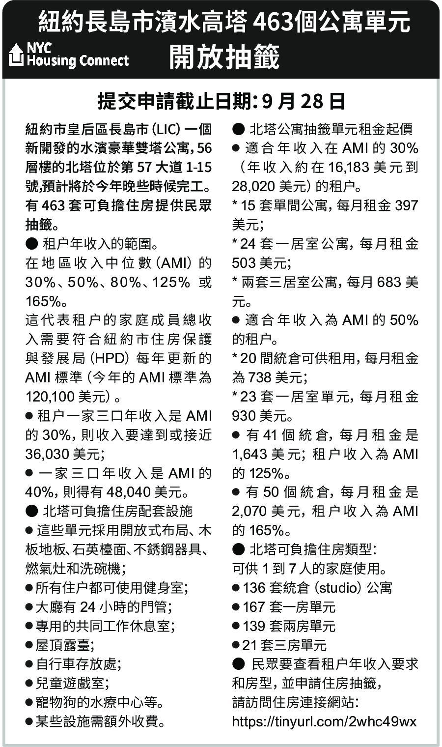 紐約市皇后區長島市(LIC)一個新開發的水濱豪華雙塔公寓,56層樓的北塔位於第57大道1-15號,預計將於今年晚些時候完工。有463套可負擔住房提供民眾抽籤。