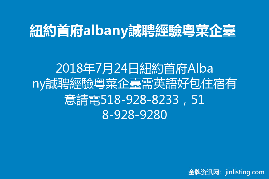 紐約首府Albany誠聘經驗粵菜企臺需英語好包住宿有意請電518-928-8233,518-928-9280
