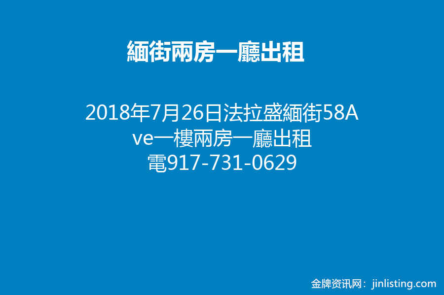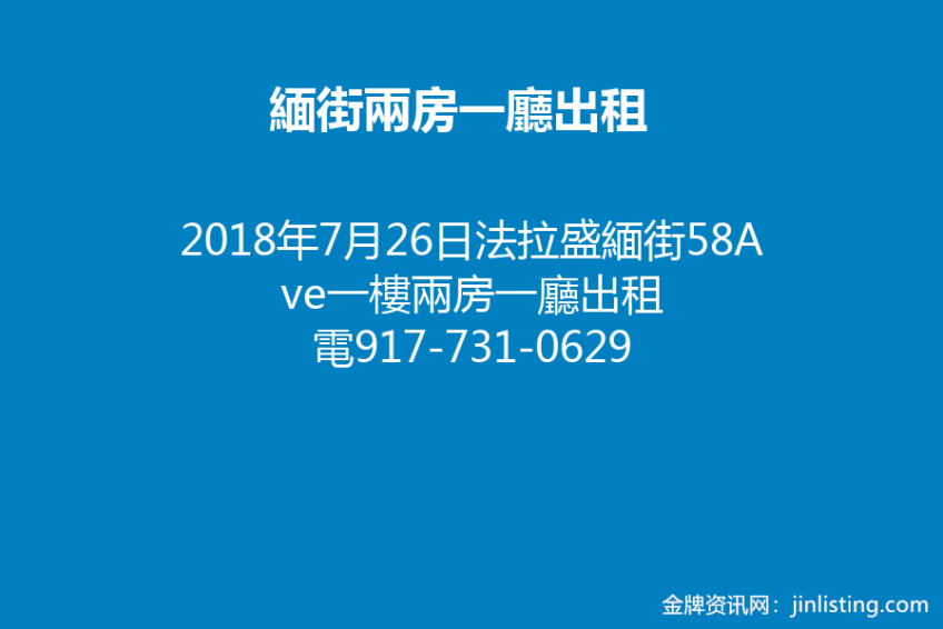法拉盛緬街58Ave一樓兩房一廳出租電 917-731-0629