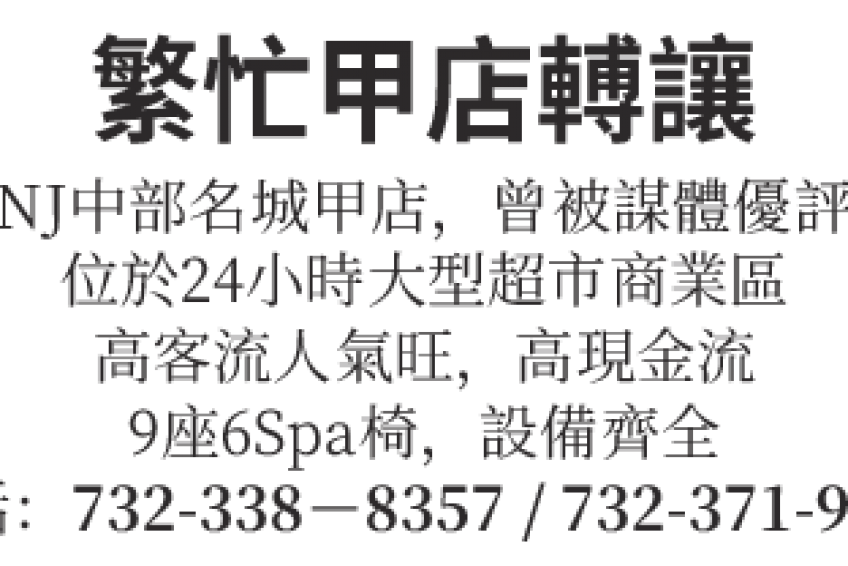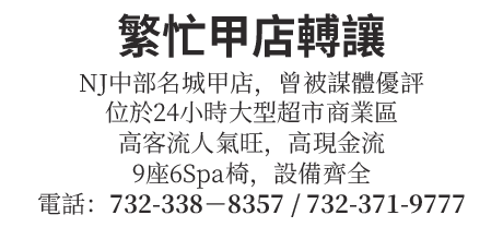 N J中部名城甲店,位24小時大型超市商業區,高客流人氣旺。9座6Spa椅,设备齊全,高現金流,曾被谋体優評。732 -338 -8357