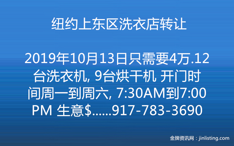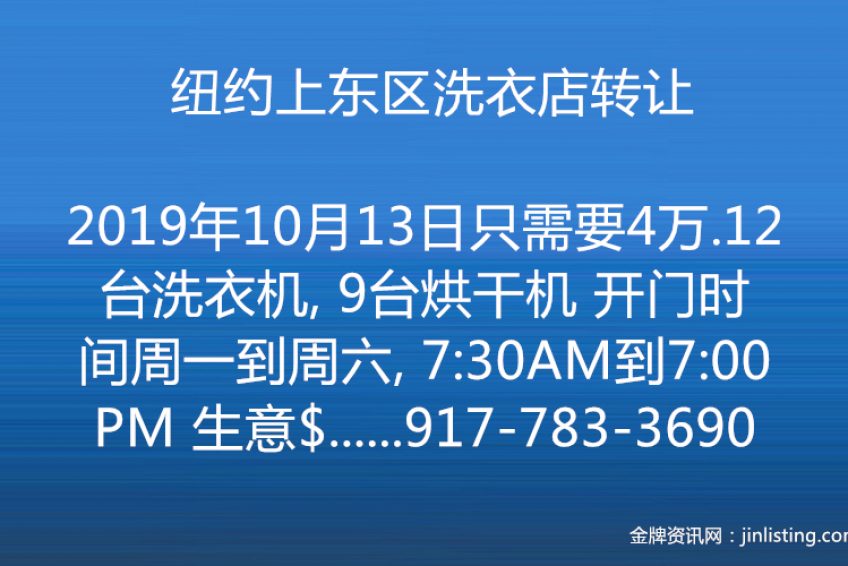 “纽约上东区洗衣店转让,只需要4万. 917-783-3690 12台洗衣机, 9台烘干机 开门时间周一到周六, 7:30AM到7:00PM 生意$14000到$15000每月. 房租地税$5500, 租约6年半 电和煤气$600, 水$600. 目前需要2人经营, 每月纯收入$6000到$7000 可以雇1个工人, 老板可以1人经营. 有意可以致电917-783-3690, 没有接听的话请text message 非诚勿扰.”