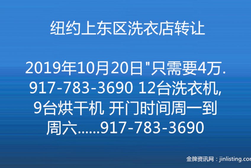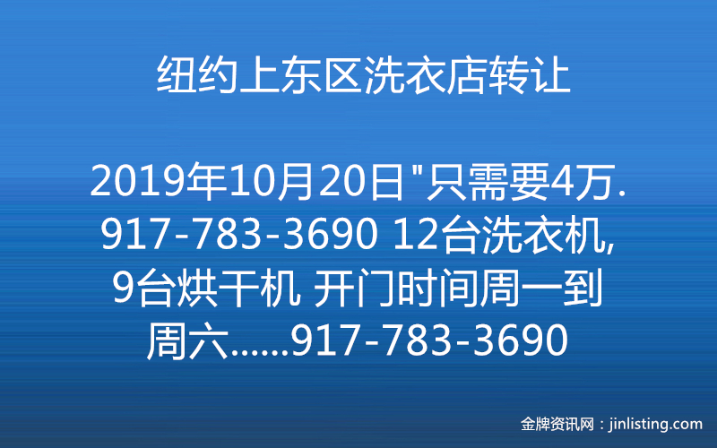 “纽约上东区洗衣店转让,只需要4万. 917-783-3690 12台洗衣机, 9台烘干机 开门时间周一到周六, 7:30AM到7:00PM 生意$14000到$15000每月. 房租地税$5500, 租约6年半 电和煤气$600, 水$600. 目前需要2人经营, 每月纯收入$6000到$7000 可以雇1个工人, 老板可以1人经营. 有意可以致电917-783-3690, 没有接听的话请text message 非诚勿扰.”