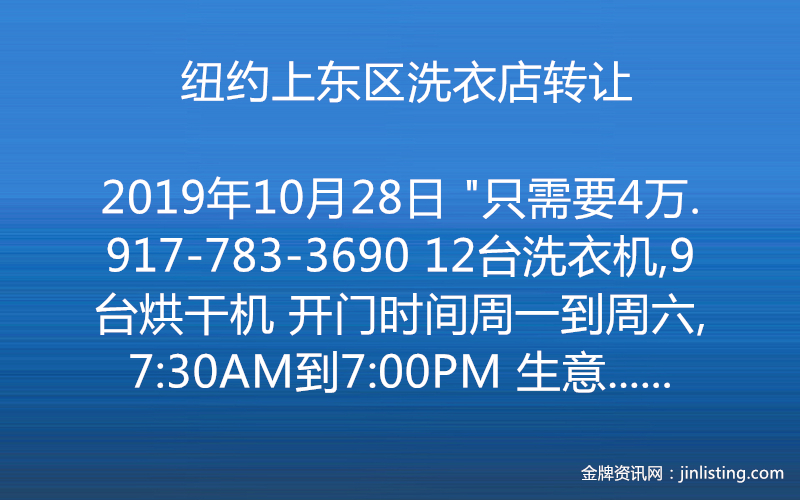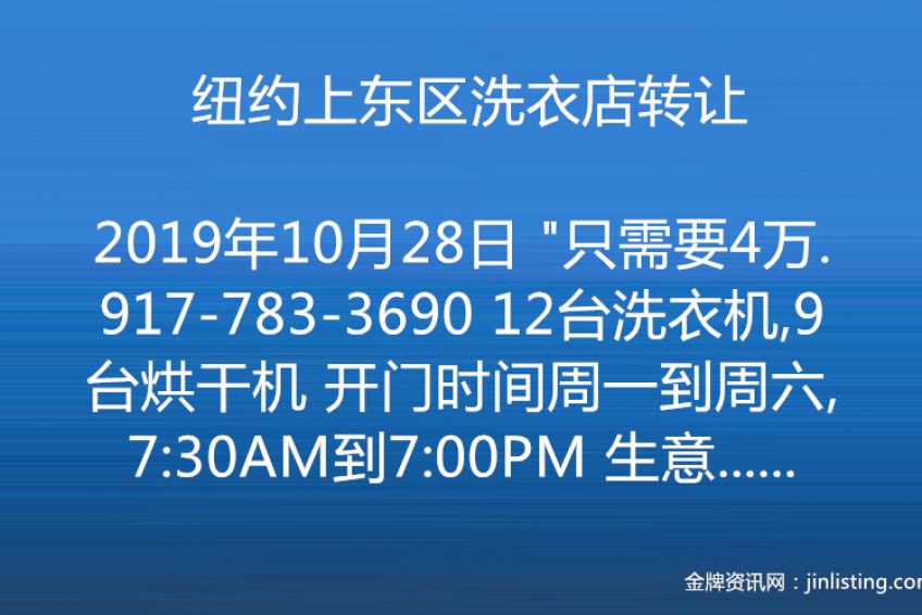 “纽约上东区洗衣店转让,只需要4万. 917-783-3690 12台洗衣机, 9台烘干机 开门时间周一到周六, 7:30AM到7:00PM 生意$14000到$15000每月. 房租地税$5500, 租约6年半 电和煤气$600, 水$600. 目前需要2人经营, 每月纯收入$6000到$7000 可以雇1个工人, 老板可以1人经营. 有意可以致电917-783-3690, 没有接听的话请text message 非诚勿扰.”