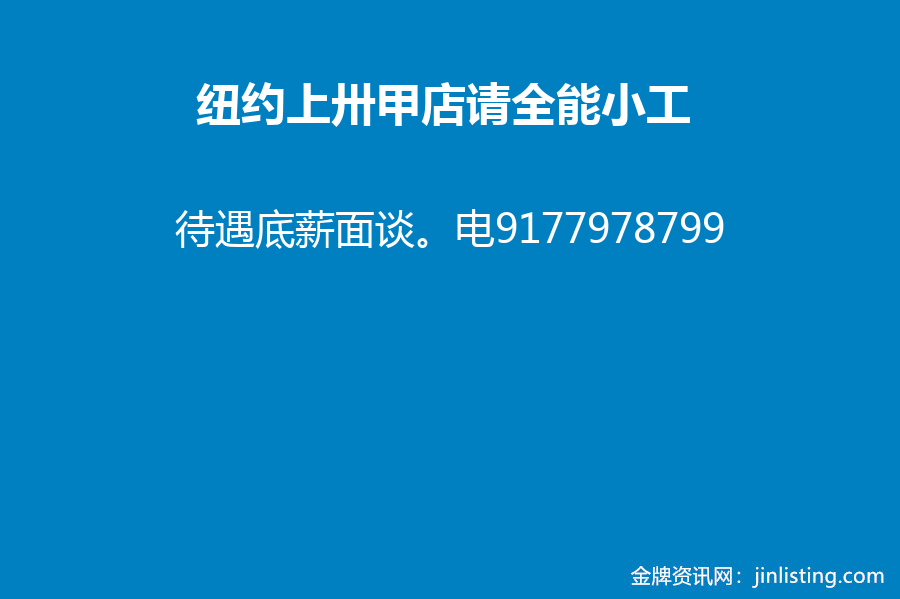 指甲店请人 纽约上卅甲店请全能小工,待遇底薪面谈。电话☎9177978799