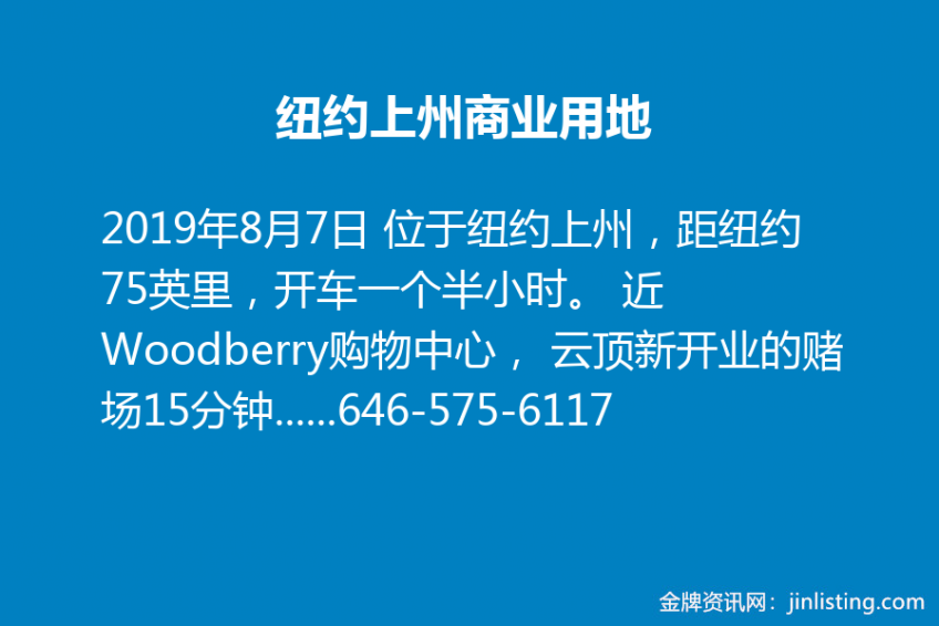 纽约上州商业用地 “位于纽约上州,距纽约75英里,开车一个半小时。 近Woodberry购物中心, 云顶新开业的赌场15分钟。 这块地总共㇒289英亩, 其中有135英亩商业用地, 8.81英亩山地绿带用地,3.88英亩城镇中心用地,要价299万美元。 135英亩商业用地已批准可用作:农业,机场,航空用品销售及修理,轻工业, 批发仓库,办公或研究机构及实验室,木业建筑及农业设备场地, 餐馆及开车取餐(如麦当劳)会议中心。另外需要当地特批的用地: 度假村,旅馆,回收站,卡车终点站,汽车修理,汽车连锁店等。 8.81英亩山地绿带用地已批准可用作:独栋别墅,高尔夫球场 ,观光牧场,野营帐篷用地,犬舍。 3.88英亩城镇中心用地可用作超市,商店,银行,邮局等。 电话:646-575-6117 微信:mynewyork4308 Email: tianmike@me.com”