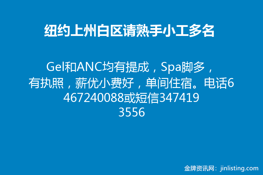 上州好区熟手小工 纽约上州白区请熟手小工多名,Gel和ANC均有提成,Spa脚多,有执照,薪优小费好,单间住宿。电话6467240088或短信3474193556