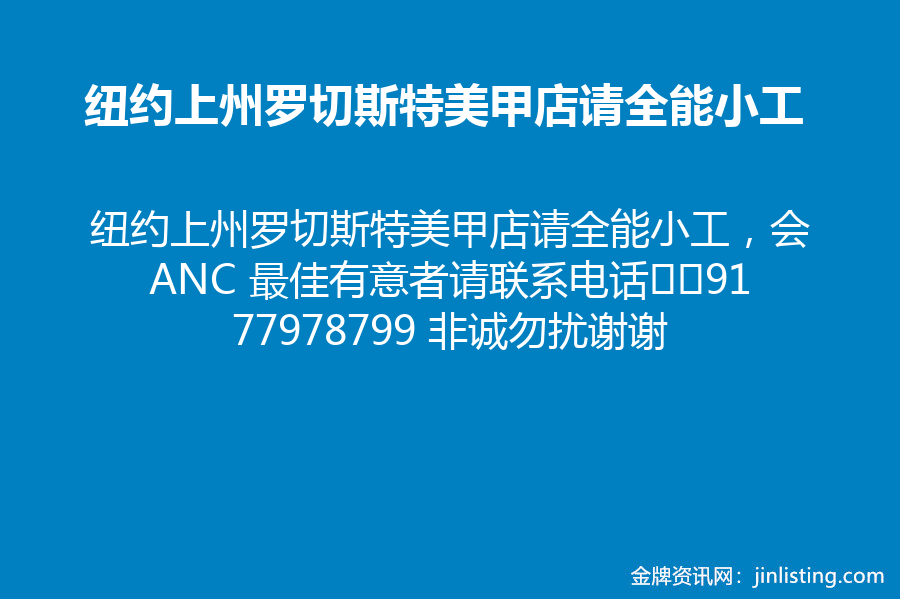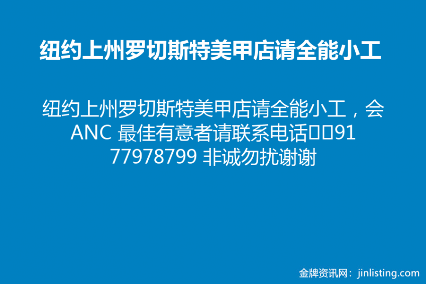 纽约上州罗切斯特美甲店请全能小工,会ANC 最佳有意者请联系电话☎9177978799 非诚勿扰谢谢