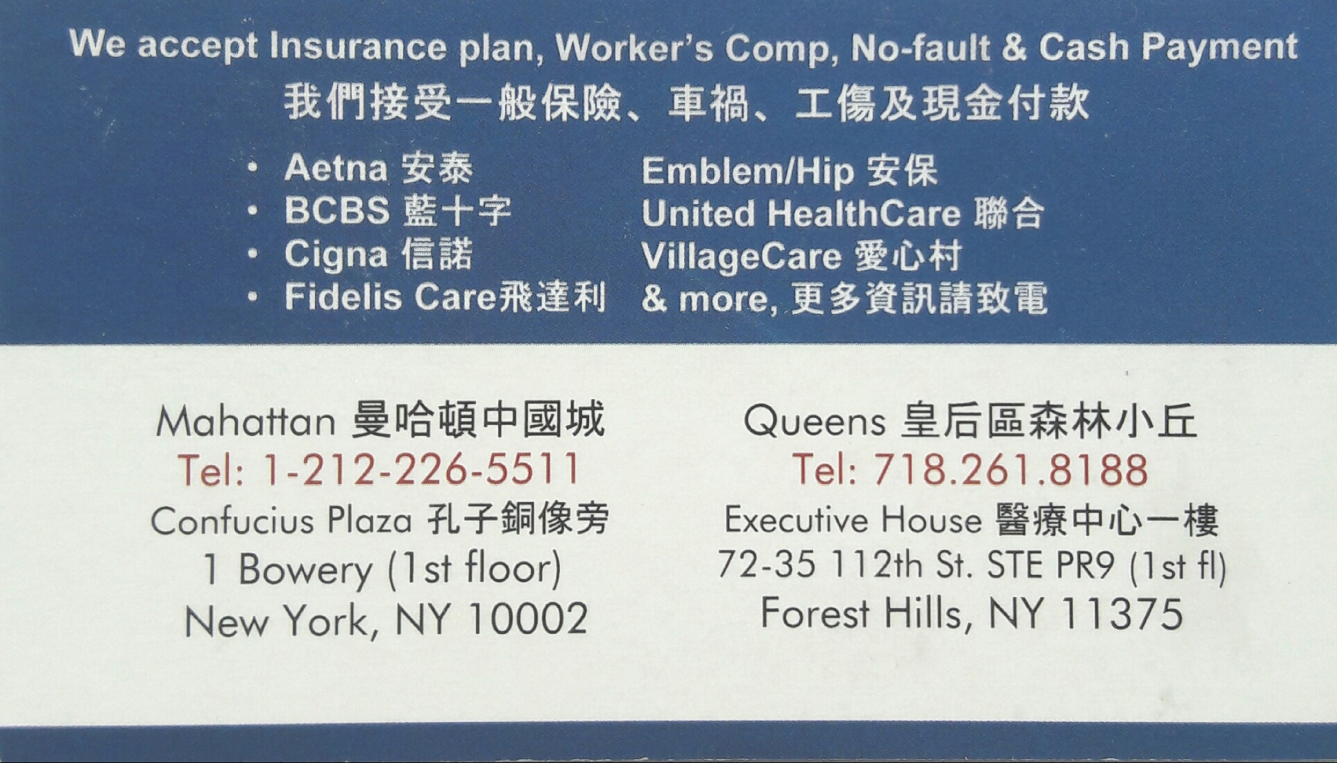 纽约中医针灸理疗诊所 212-226-5511 718-261-8188 72-35 112th St. STE PR9 (1st fl) Forest Hills, NY 11375