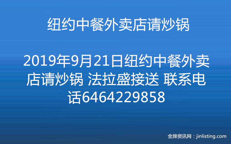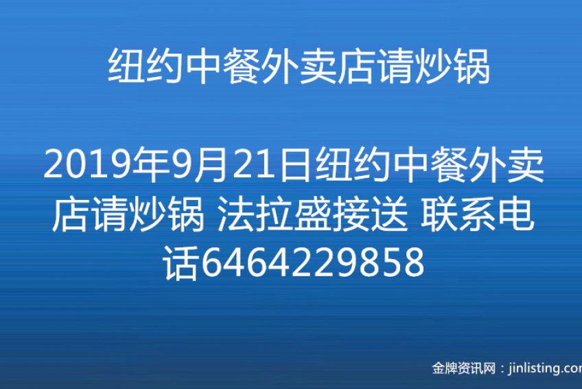 纽约中餐外卖店请炒锅 法拉盛接送 联系电话6464229858