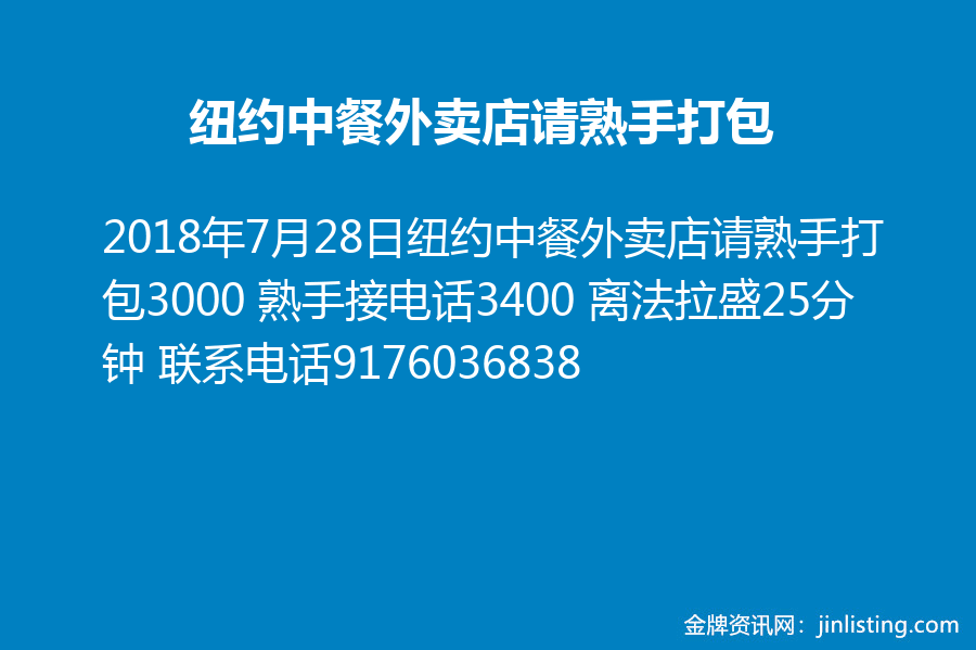 纽约中餐外卖店请熟手打包3000 熟手接电话3400 离法拉盛25分钟 联系电话9176036838