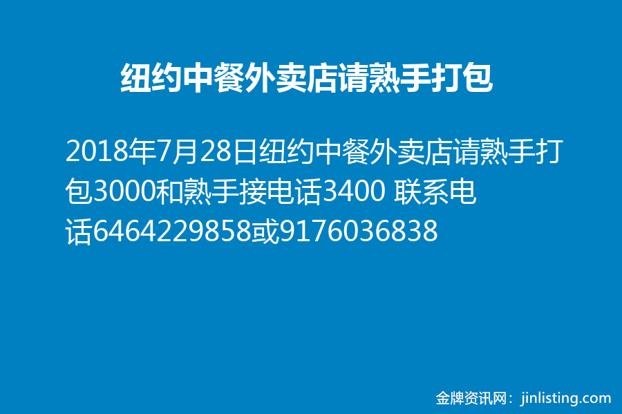 纽约中餐外卖店请熟手打包3000和熟手接电话3400 联系电话6464229858或9176036838