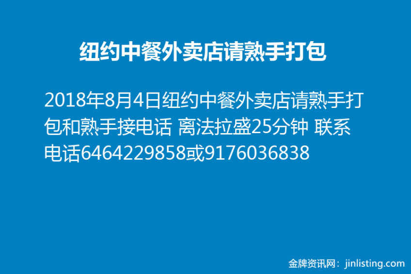 纽约中餐外卖店请熟手打包和熟手接电话 离法拉盛25分钟 联系电话6464229858或9176036838