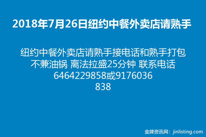 纽约中餐外卖店请熟手接电话和熟手打包 不兼油锅 离法拉盛25分钟 联系电话 6464229858或9176036838