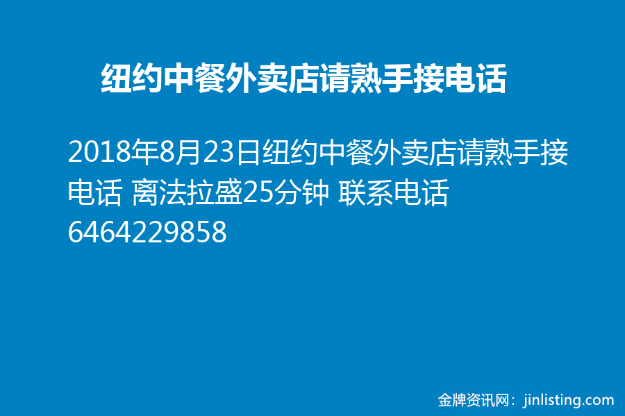 纽约中餐外卖店请熟手接电话 离法拉盛25分钟 联系电话6464229858