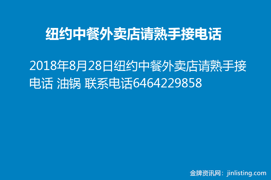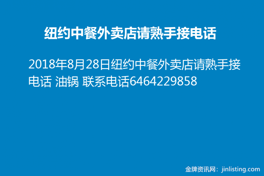 纽约中餐外卖店请熟手接电话 油锅 联系电话6464229858