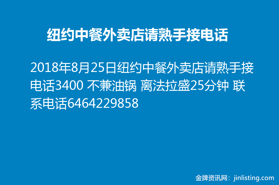 纽约中餐外卖店请熟手接电话3400 不兼油锅 离法拉盛25分钟 联系电话6464229858