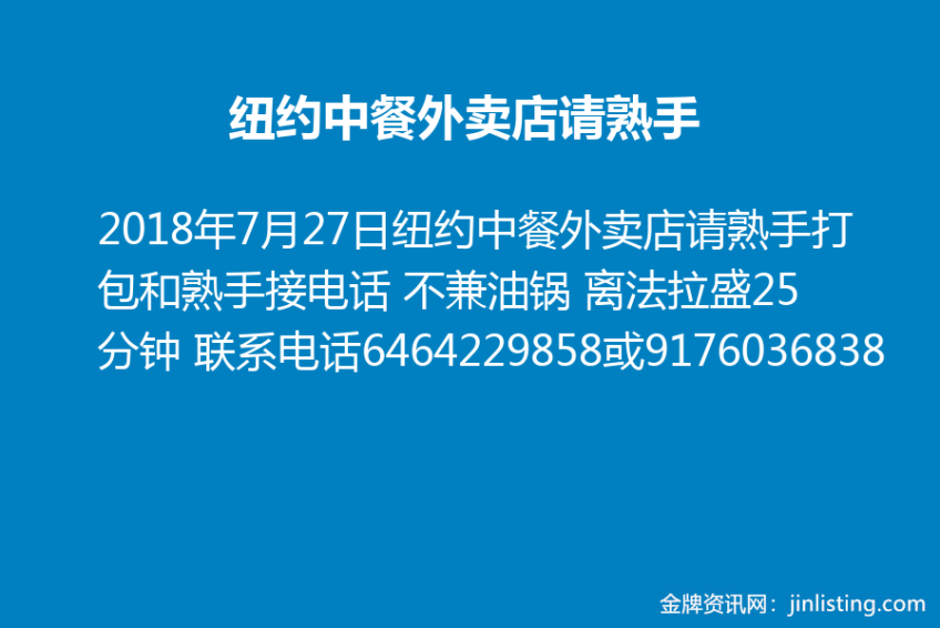 纽约中餐外卖店请熟手打包和熟手接电话 不兼油锅 离法拉盛25分钟 联系电话6464229858或9176036838