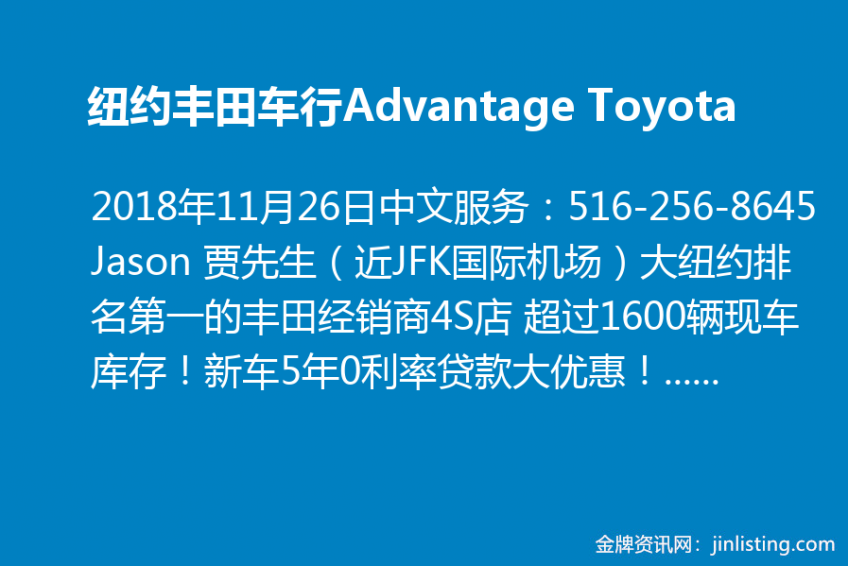 “中文服务:516-256-8645 Jason 贾先生(近JFK国际机场)