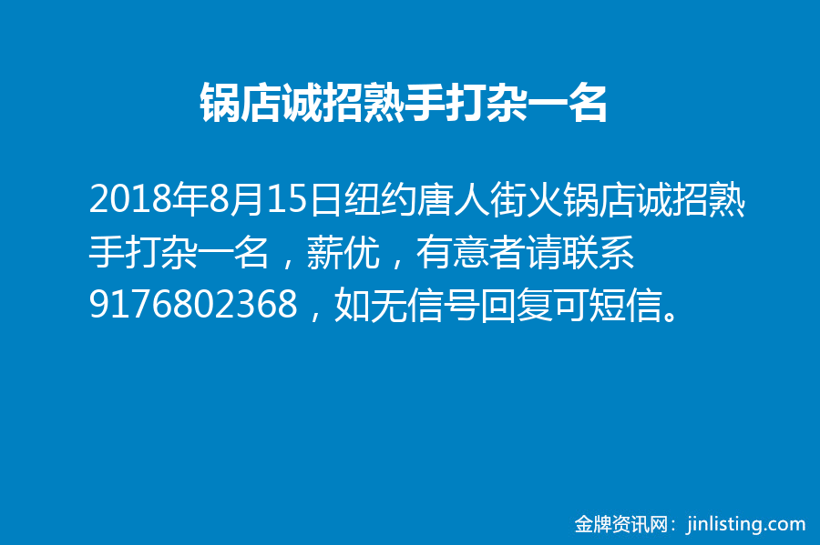纽约唐人街火锅店诚招熟手打杂一名 9176802368