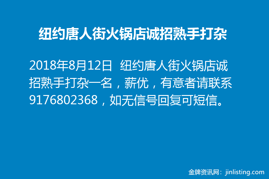 纽约唐人街火锅店诚招熟手打杂一名,薪优,有意者请联系9176802368,如无信号回复可短信。
