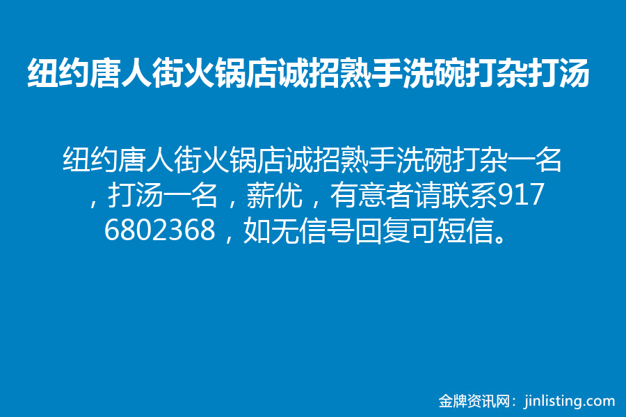 纽约唐人街火锅店诚招熟手洗碗打杂一名,打汤一名,薪优,有意者请联系9176802368,如无信号回复可短信。