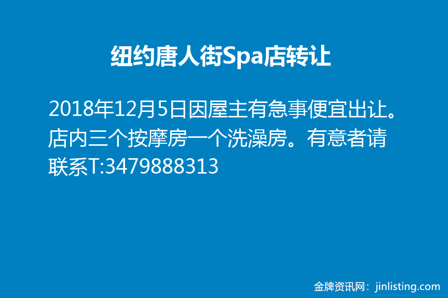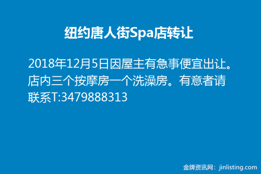 纽约唐人街Spa店转让,因屋主有急事便宜出让。店内三个按摩房一个洗澡房。有意者请联系T:3479888313