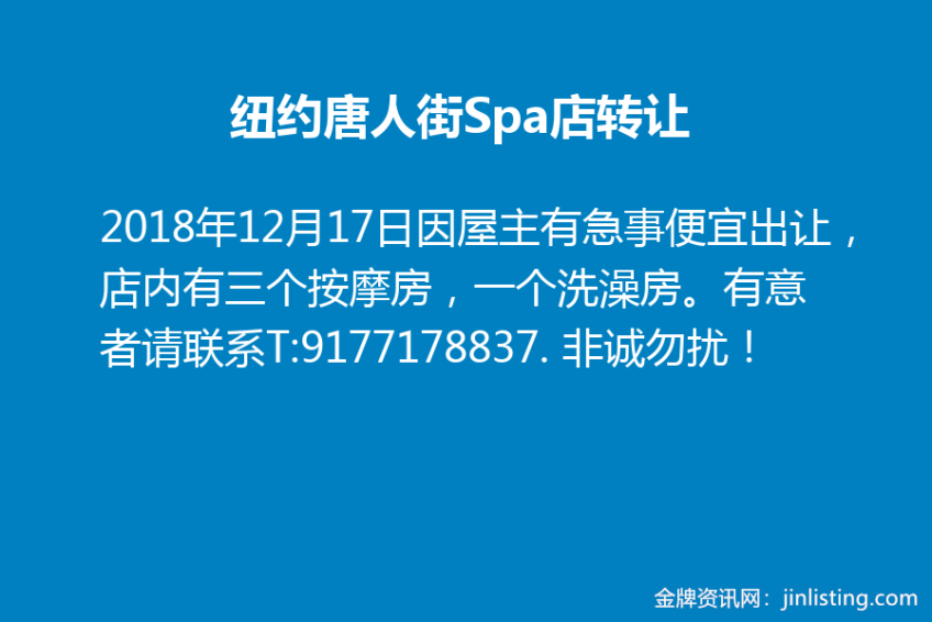 纽约唐人街Spa店转让,因屋主有急事便宜出让,店内有三个按摩房,一个洗澡房。有意者请联系T:9177178837. 非诚勿扰!