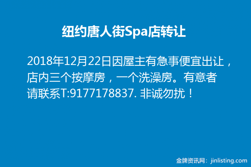 纽约唐人街Spa店转让 因屋主有急事便宜出让,店内三个按摩房,一个洗澡房。有意者请联系T:9177178837. 非诚勿扰!