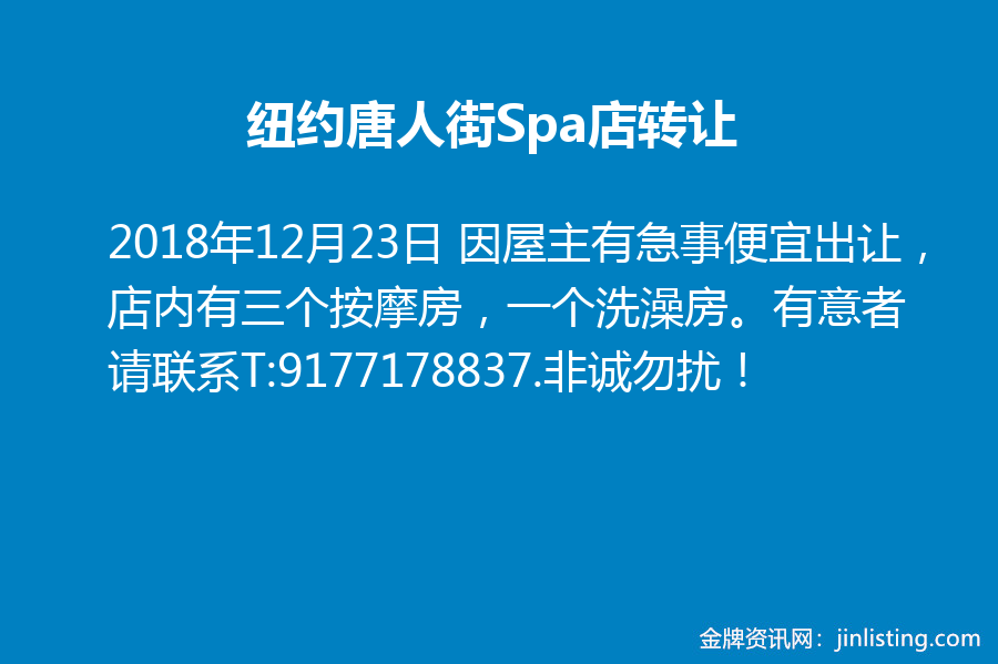 纽约唐人街Spa店转让 因屋主有急事便宜出让,店内有三个按摩房,一个洗澡房。有意者请联系T:9177178837.非诚勿扰!