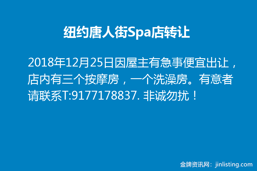 纽约唐人街Spa店转让 因屋主有急事便宜出让,店内有三个按摩房,一个洗澡房。有意者请联系T:9177178837. 非诚勿扰!