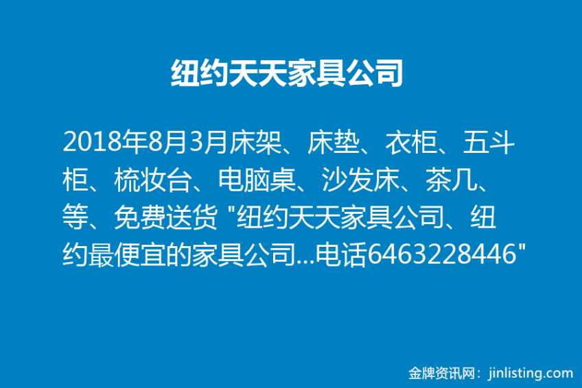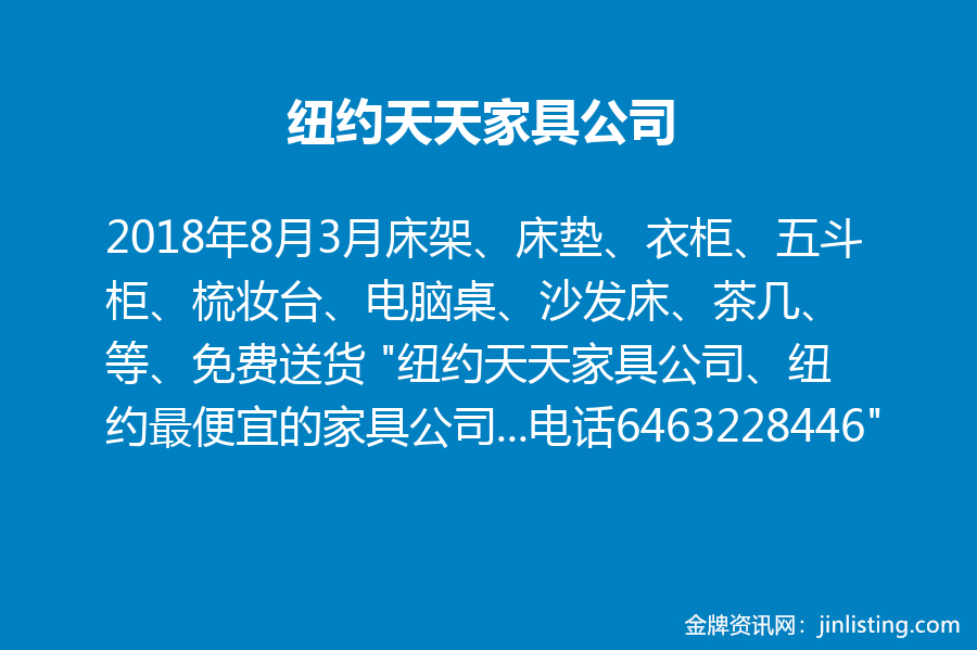 床架、床垫、衣柜、五斗柜、梳妆台、电脑桌、沙发床、茶几、等、免费送货 “纽约天天家具公司、纽约最便宜的家具公司,全新单人床架105、全新五斗柜只卖88、全新沙发床只卖115、全新床头柜只卖60,全新床垫价格优惠,布鲁克林、法拉盛、皇后区,免费送货更多优惠家具请加微信号jiaju6463228446,可扫描二维码添加我们。 电话6463228446”