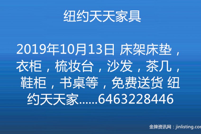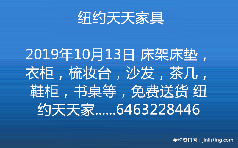床架床垫,衣柜,梳妆台,沙发,茶几,鞋柜,书桌等,免费送货 纽约天天家具网www.nytiantianjiaju.com大型网络家具公司,网站所有东西都是免费送货,我们以优质的服务态度、跟快捷的送货效率红遍纽约市,欢迎登入我们的网站或加公司微信号:nytiantianjiaju 公司电话:6463228446