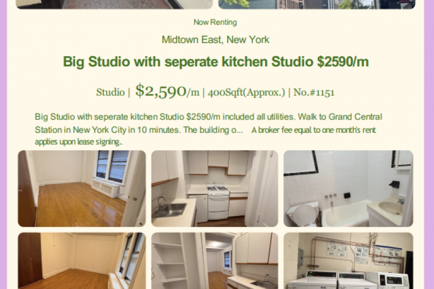 纽约市曼哈顿中城统舱$2290/月, $2590 和$2650/月正在出租