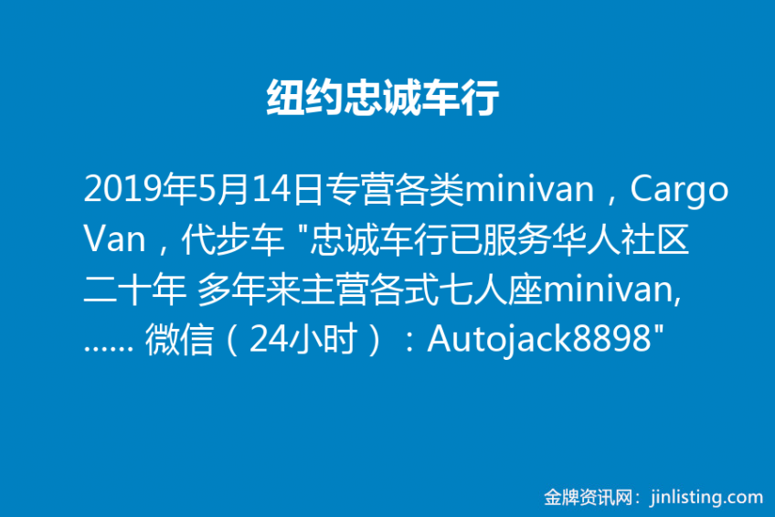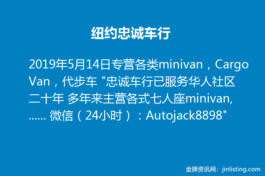 纽约忠诚车行专营各类minivan,Cargo Van,代步车 “忠诚车行已服务华人社区二十年 多年来主营各式七人座minivan, Cargo Van, 及各类实惠省油小车 批发价格 车况极佳 另可办理超低利息贷款 延长保修 保险业务等 地址:132-33 14th Ave,Flushing,NY 11356 电话:718-767-8898 营业时间:星期一 至 星期六 早10点-晚6点 微信 (24小时):Autojack8898”