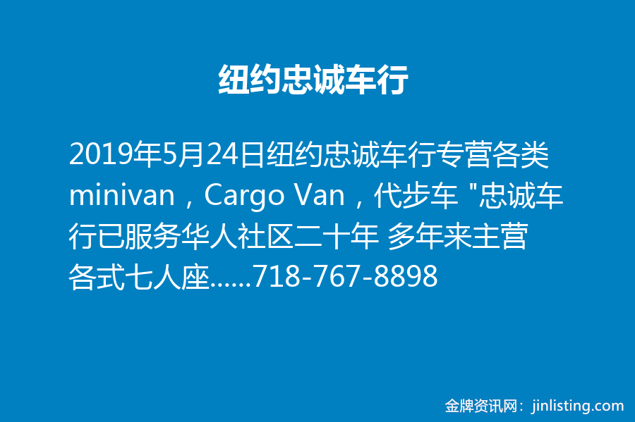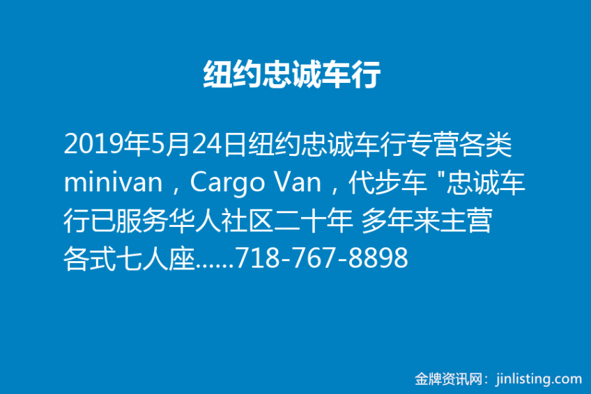 纽约忠诚车行专营各类minivan,Cargo Van,代步车 “忠诚车行已服务华人社区二十年 多年来主营各式七人座minivan, Cargo Van, 及各类实惠省油小车 批发价格 车况极佳 另可办理超低利息贷款 延长保修 保险业务等 地址:132-33 14th Ave,Flushing,NY 11356 电话:718-767-8898 营业时间:星期一 至 星期六 早10点-晚6点 微信 (24小时):Autojack8898”