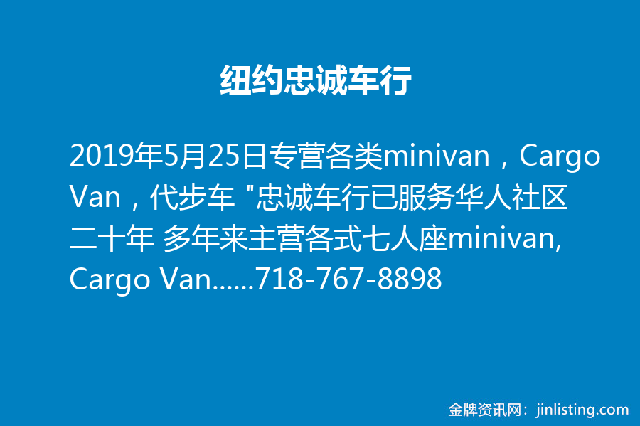 纽约忠诚车行专营各类minivan,Cargo Van,代步车 “忠诚车行已服务华人社区二十年 多年来主营各式七人座minivan, Cargo Van, 及各类实惠省油小车 批发价格 车况极佳 另可办理超低利息贷款 延长保修 保险业务等 地址:132-33 14th Ave,Flushing,NY 11356 电话:718-767-8898 营业时间:星期一 至 星期六 早10点-晚6点 微信 (24小时):Autojack8898”