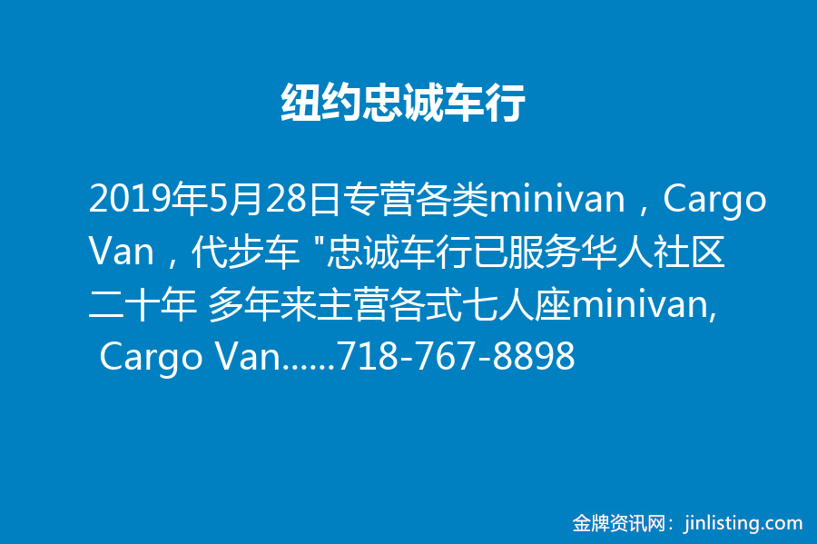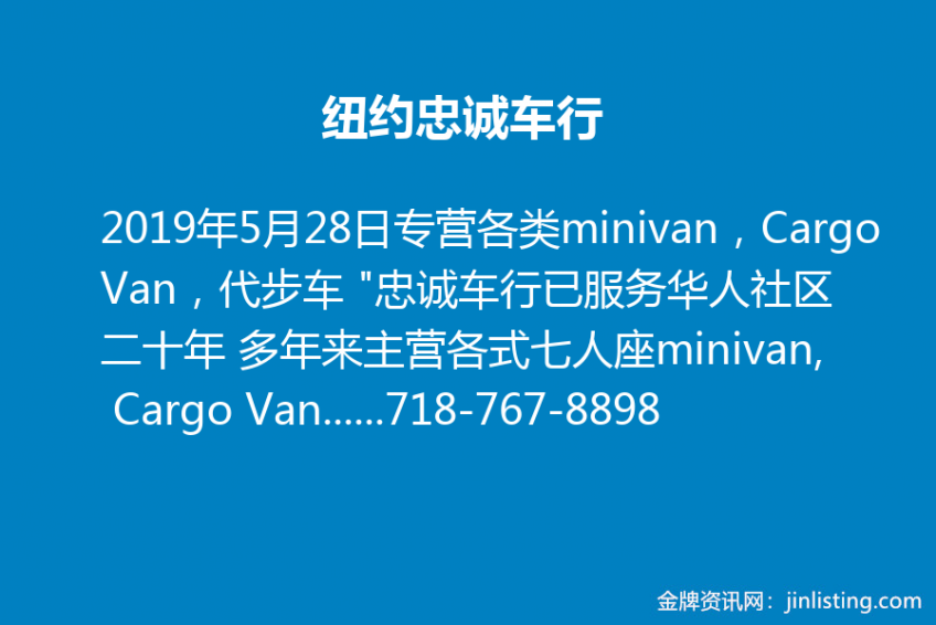 纽约忠诚车行专营各类minivan,Cargo Van,代步车 “忠诚车行已服务华人社区二十年 多年来主营各式七人座minivan, Cargo Van, 及各类实惠省油小车 批发价格 车况极佳 另可办理超低利息贷款 延长保修 保险业务等 地址:132-33 14th Ave,Flushing,NY 11356 电话:718-767-8898 营业时间:星期一 至 星期六 早10点-晚6点 微信 (24小时):Autojack8898”