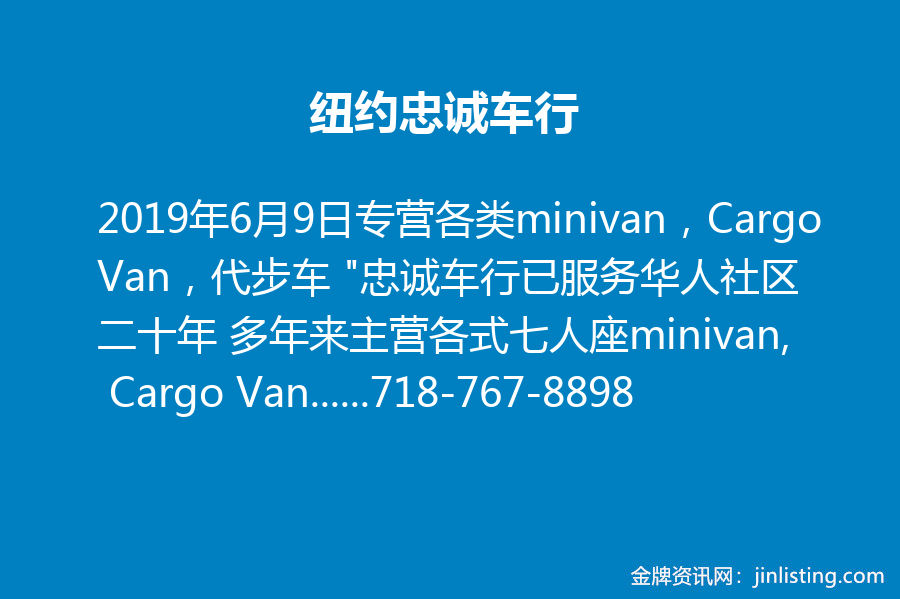 纽约忠诚车行专营各类minivan,Cargo Van,代步车 “忠诚车行已服务华人社区二十年 多年来主营各式七人座minivan, Cargo Van, 及各类实惠省油小车 批发价格 车况极佳 另可办理超低利息贷款 延长保修 保险业务等 地址:132-33 14th Ave,Flushing,NY 11356 电话:718-767-8898 营业时间:星期一 至 星期六 早10点-晚6点 微信 (24小时):Autojack8898”