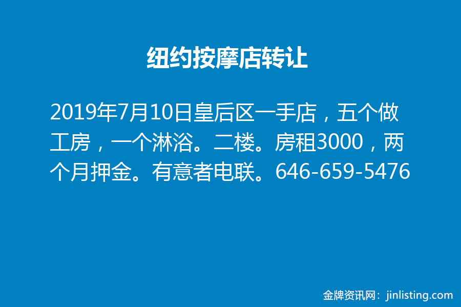 纽约按摩店转让 皇后区一手店,五个做工房,一个淋浴。二楼。房租3000,两个月押金。有意者电联。646-659-5476