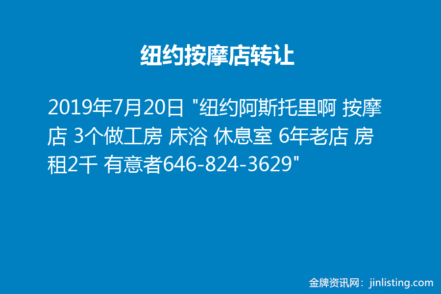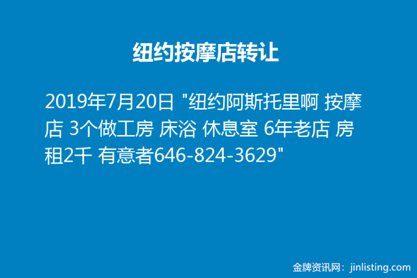纽约按摩店转让 “纽约阿斯托里啊 按摩店 3个做工房 床浴 休息室 6年老店 房租2千 有意者646-824-3629”
