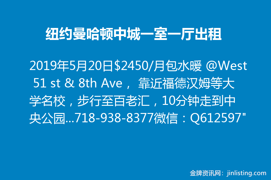 “No.RAM0557 纽约曼哈顿中城一室一厅出租_$2450/月包水暖 @West 51 st & 8th Ave, 靠近福德汉姆等大学名校,步行至百老汇,10分钟走到中央公园。 附近街区有很多餐馆,咖啡,商店,以及各类休闲场所。 装修新,新移民或国际学生付一押二即可。 地段好,入住手续简单。 Wendy 电话:718-938-8377微信:Q612597”