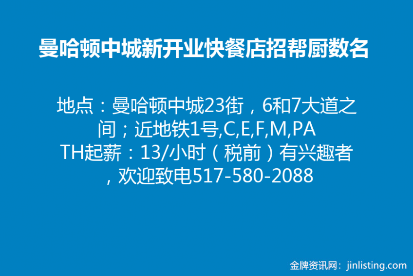 “纽约曼哈顿中城新开业快餐店招帮厨数名,需报税 517-580-2088”