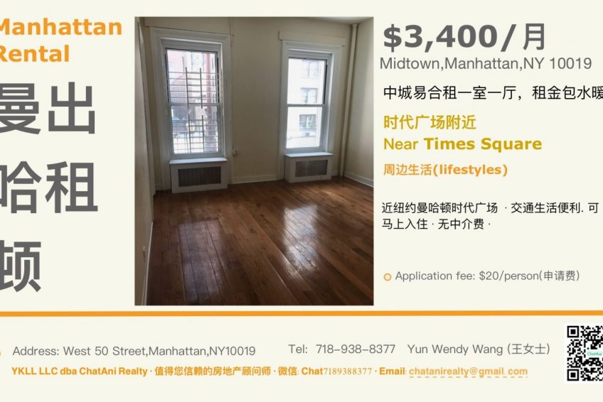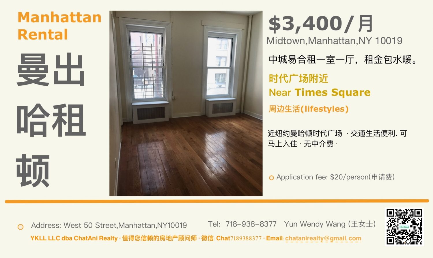 纽约曼哈顿中城时代广场附近一室一厅公寓3400无佣金