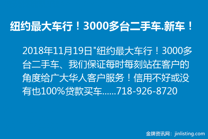 “纽约最大车行!3000多台二手车、我们保证每时每刻站在客户的角度给广大华人客户服务!